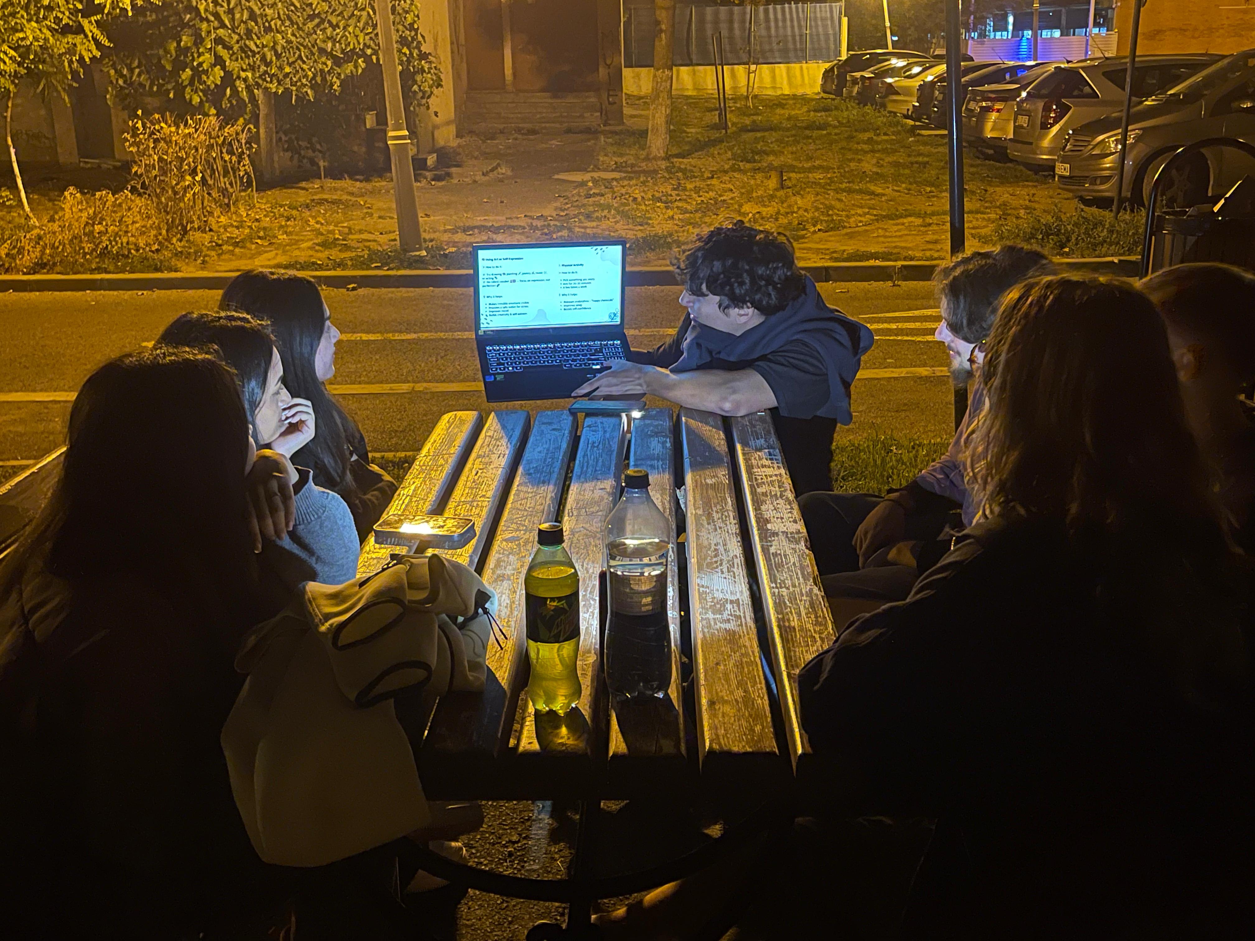 The workshop atmosphere encouraged creativity, intercultural solidarity, and the exchange of personal experiences, creating a safe space for reflection and mutual learning. The target group consisted of university students aged 19 to 23. The activity was held outdoors, in a park in Galați, which contributed to a relaxed and open environment for discussion and participation.